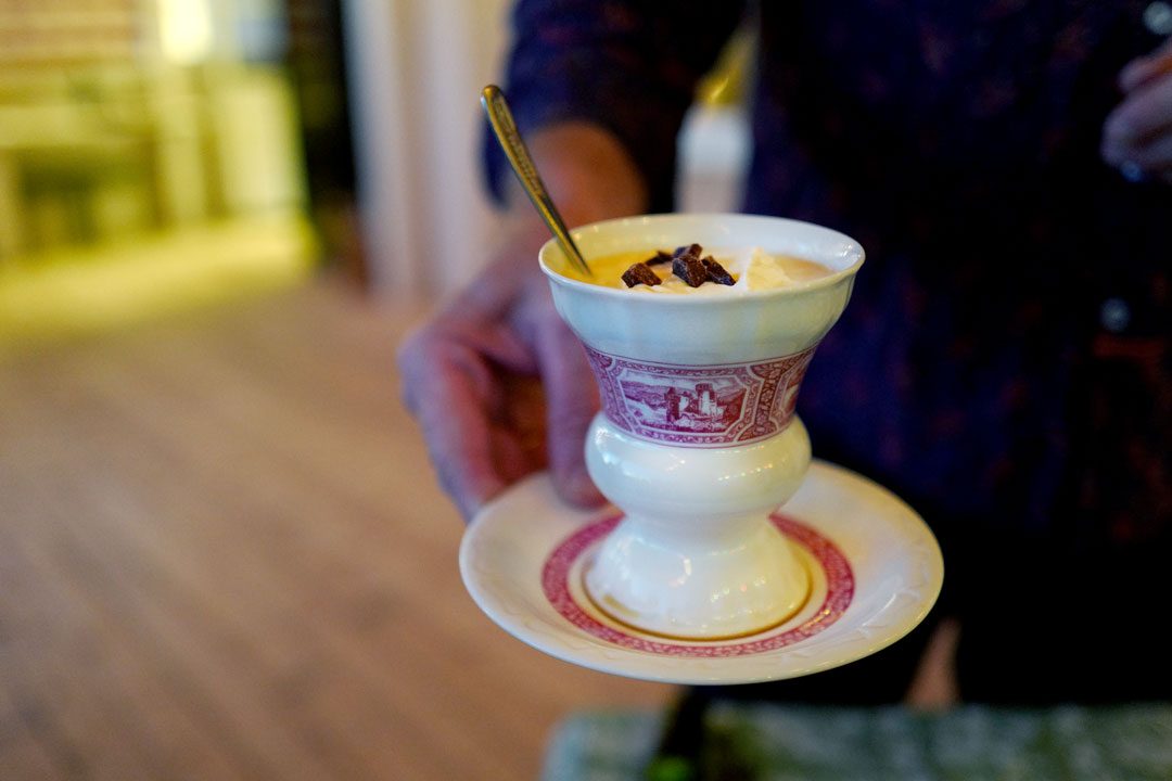 Forvaltervillaen fungerer som restaurant og bakeri. Når det blir kaldt i været trekker gjestene inn rundt langbordet i spisestuen.