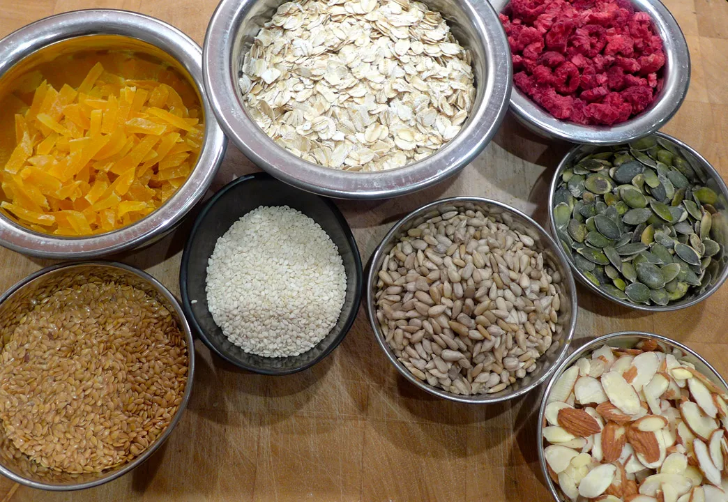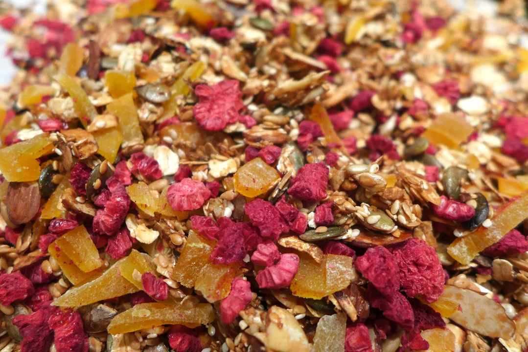 Når kornblandingen er kald tilsetter du grovhakket tørket mango (aprikoser eller rosiner kan også brukes) og evt frysetørket bringebær. Dette får du kjøpt i helsekostbutikker.