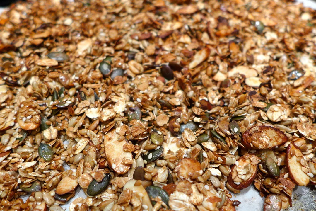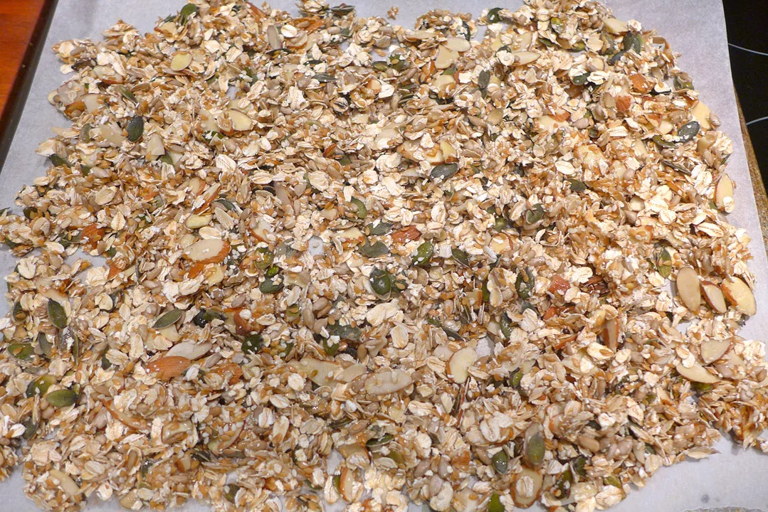 Bland alle disse ingrediensene og spre det utover et bakepapir på en bakeplate. Sett platen inn i den forvarmede ovnen og stek i 15 minutter. Halvveis ute i steketiden, tar du platen ut av ovnen og rører i blandingen slik at ikke noe brenner seg, og slik at alle kornene og frøene blir stekt.