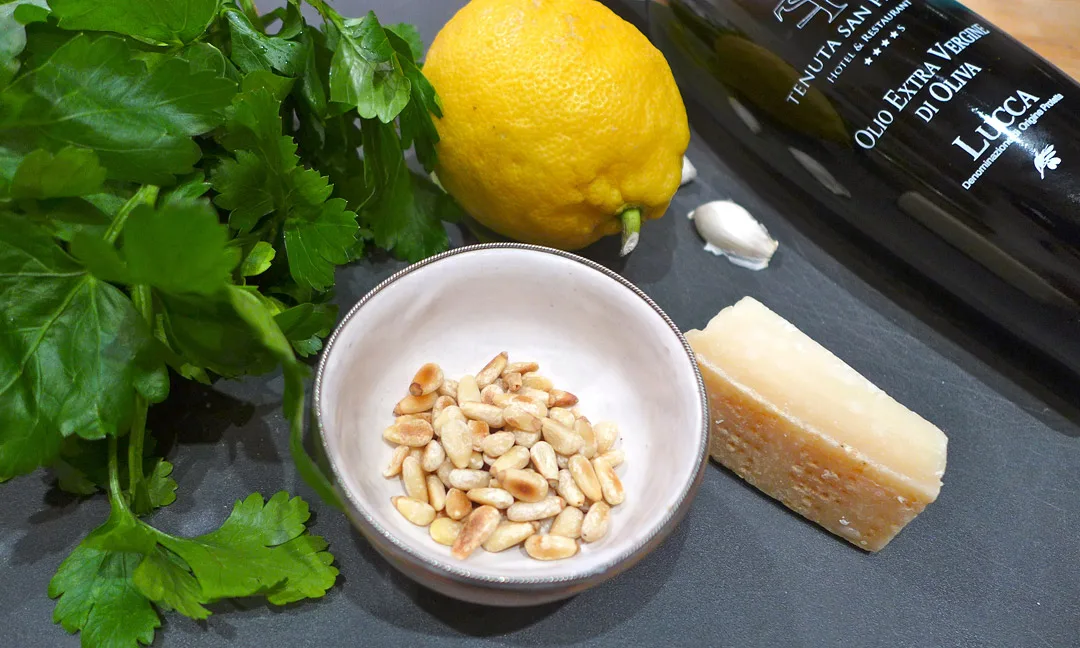 Kjør persille (blader og stilker), parmesan (i biter), pinjekjerner, sitronskall og saft, hvitløk og et dryss salt i en blender/kjøkkenmaskin. Spe med god olivenolje til du har oppnådd den konsistensen du vil.