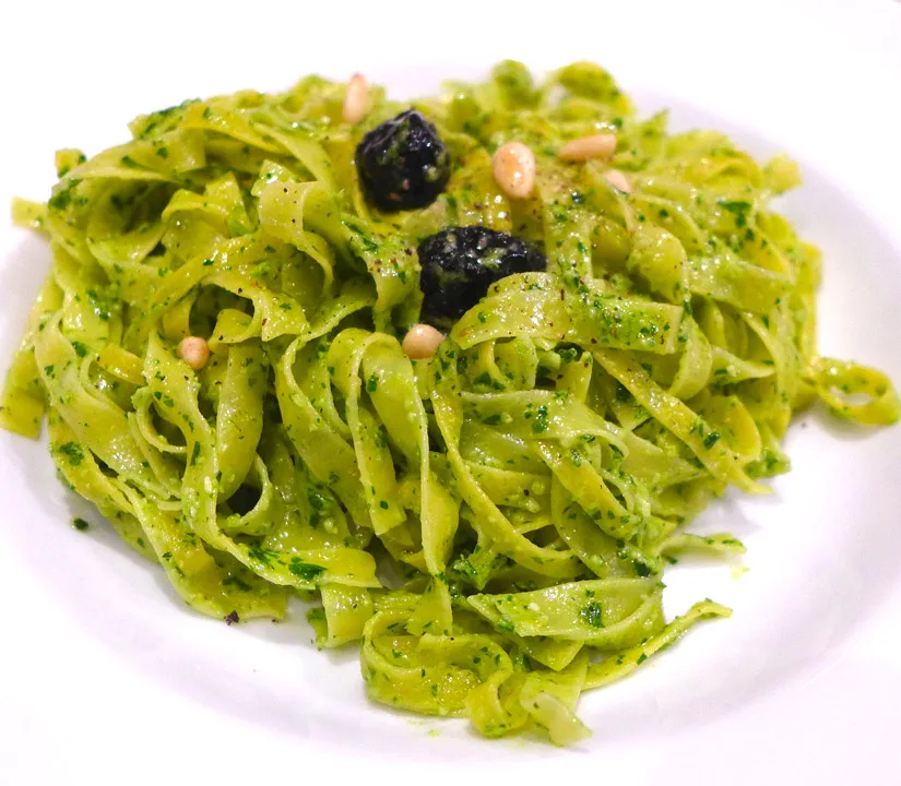 Jeg serverte den til båndpasta sammen med sorte oliven og noen ristede pinjekjerner og god olivenolje på toppen. Veggismat kan være godt. Rett og slett. Pestoen er også perfekt til et stykke hvit fisk.