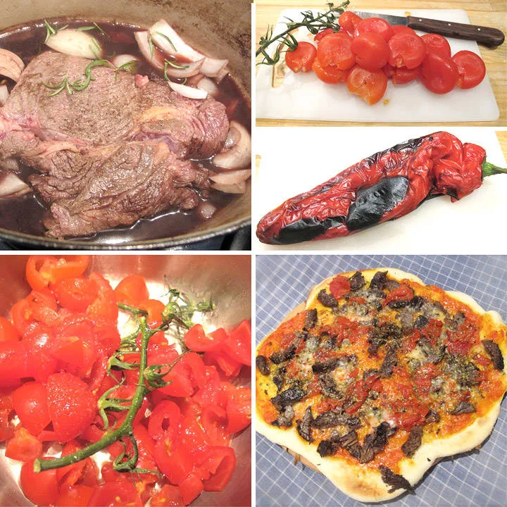 • For meg var det viktig å gjøre pizzaen så lik originalen som mulig i form av råvarer. Paprika, storfekjøtt, tomatsaus, krydder og ost. Konsistensen på pizzakjøttet (på originalen) er løs , så vanlig stekt biff ville ikke gå. Derfor tok jeg utgangspunkt i høyrygg av okse. Dette er et billig og herlig stykke av storfe som trenger lang koketid for å få det skikkelig mørt. Med litt smak i kokevannet ble kjøttet utrolig smakfullt. Det var et perfekt valg. Konsistensen og smaken ble perfekt.