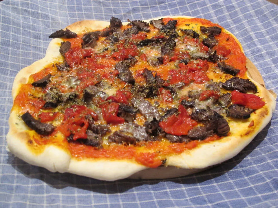 Ok! Nå er det bare å smøre tomatsaus på pizzabunnen. Legge kjøtt og paprika på. Krydre litt med oregano, salt og pepper og så strø et tynt lag revet Gruyère-ost på toppen. Stek gyllen og sprø i ovnen, på grillen eller i en pizzaovn.