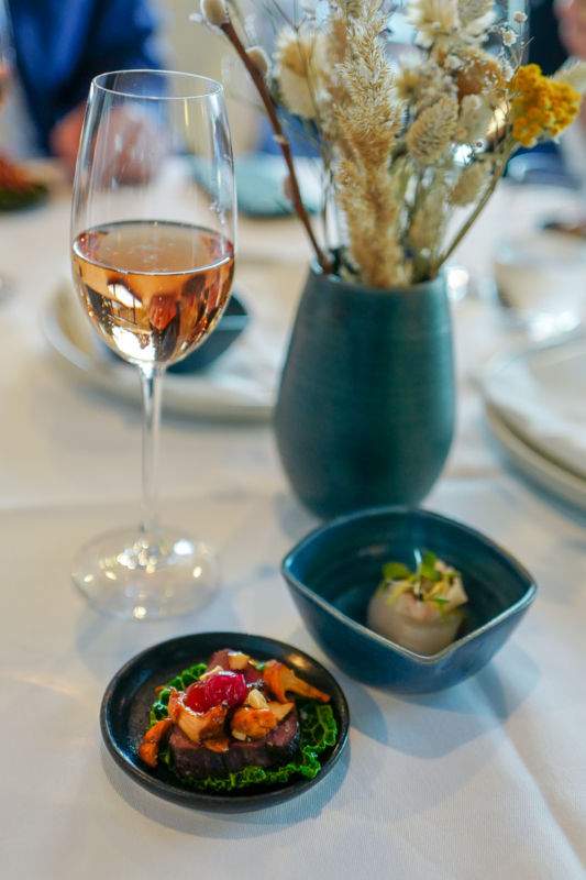 Vi setter oss og får servert rosa Bollinger champagne i glassene. En bra start. Små munnfuller kommer inn på bordet slik det er vanlig på gourmetrestauranter. Det er kamskjell med lardo og syltet sitron og savoykål med oksefilet og kantareller. Deilig fingermat til boblene.