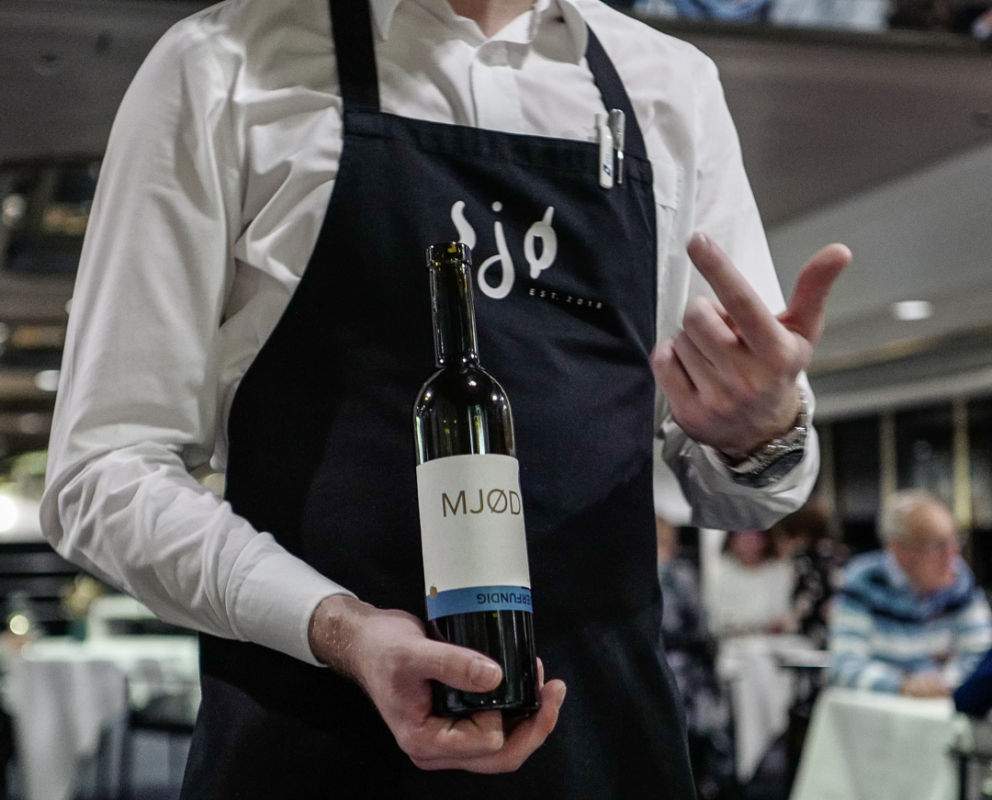 Fra rødvin til Mjød. Vi får ufiltrert dansk mjød i glassene fra produsenten ved navn Underfundig der mjødet er blandet med eplemost for å gjøre drikken lettere.