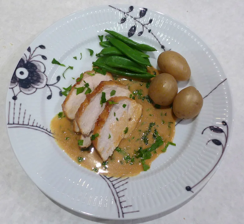 Dette er den ultimate retten. Den er nostalgisk for meg. Jeg har vokst opp med den og jeg forbinder den bare med glede og hygge. Dette er min versjon av mormors kyllingstek. Jeg bruker i dag fine kyllingbryst med skinn på i stedet for hel kylling (noen ganger velger jeg hel kylling. Perfekt når du skal lage retten til flere enn to) og jeg bruker flatpersille fremfor kruspersille. Ellers er retten ganske lik den mormor lagde til meg hvert år da jeg var på besøk i Danmark. Retten er så ufattelig lett å lage og den inneholder kun noen få ingredienser: sukker, fløte, smør, persille, salt, pepper og kylling. og bittelitt sitronsaft. De som kjenner meg vet at jeg elsker krydder. Derfor er det jo litt rart at jeg elsker denne retten som er så enkel i smaken, eller hva? Men smaken er ikke enkel. Retten smaker herlig av karamell og innkokt persille. Den er perfekt. Jeg har tidligere postet oppskriften her på bloggen, men nå er det jaggu meg på tide igjen.