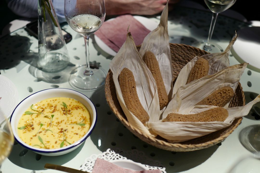 Maisbrød og maissmør. Så kreativt og smaken er helt fantastisk. Man dypper brødet, som har en ekte maiskjerne, i maissmøret.