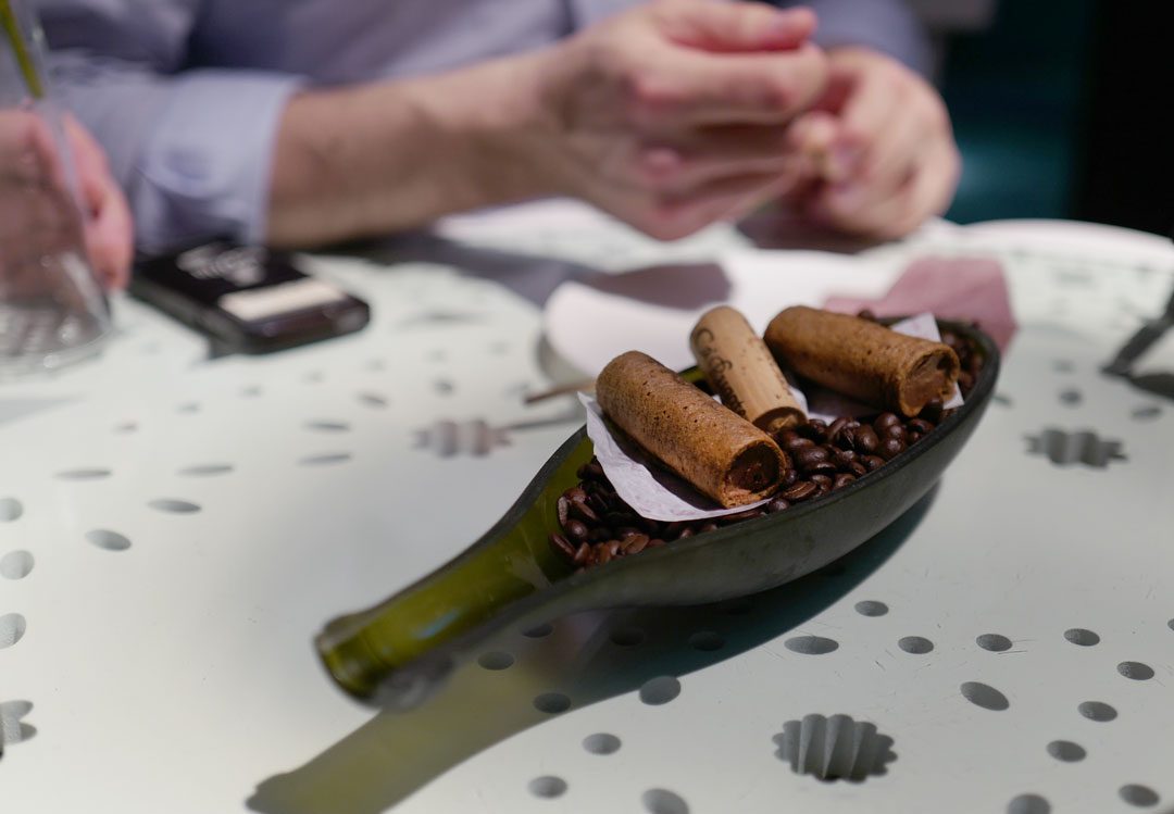 Hva er dessert og hva er vinkork? Korkene er laget av sjokolade, kaffe og krokan.