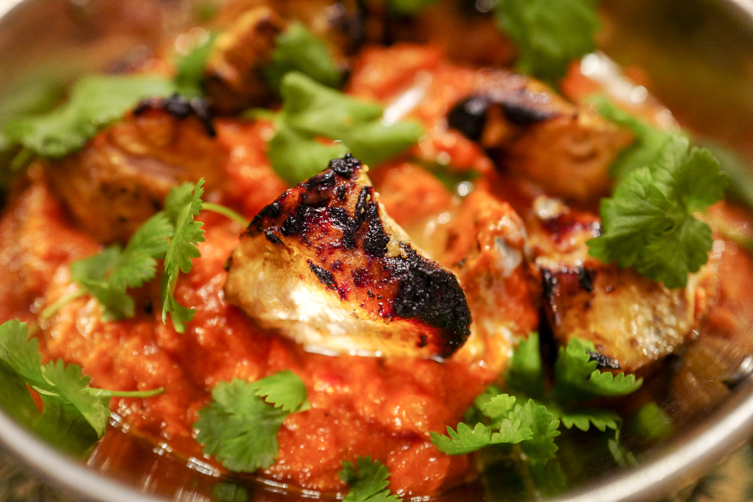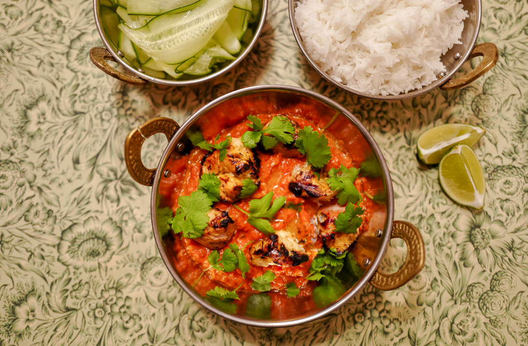 Tandoori-kylling er stykker av kylling som er grillet ganske heftig. Den skriker etter en god saus, og det var akkurat de tre herrene i Dehli gjorde. De lagde en tomatbasert saus med smør og fløte som passet perfekt til den grillede kyllingen.