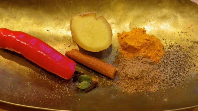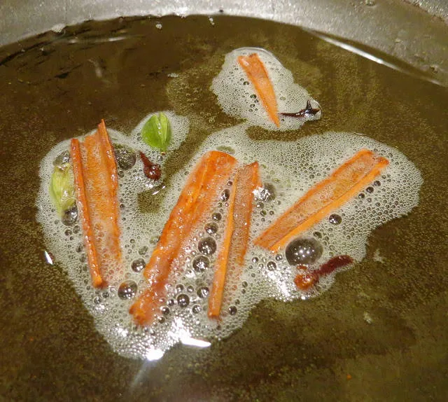 Varm oljen (evt ghee) i en panne og la kanel, nellikspiker og kardemomme få smakssatt oljen. Dette tar noen minutter.