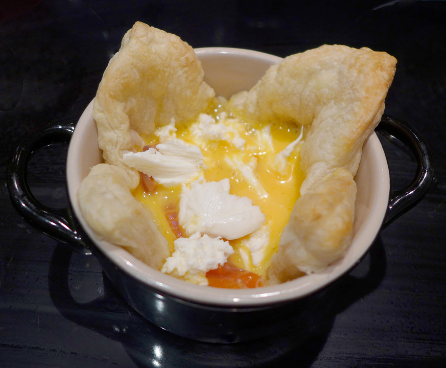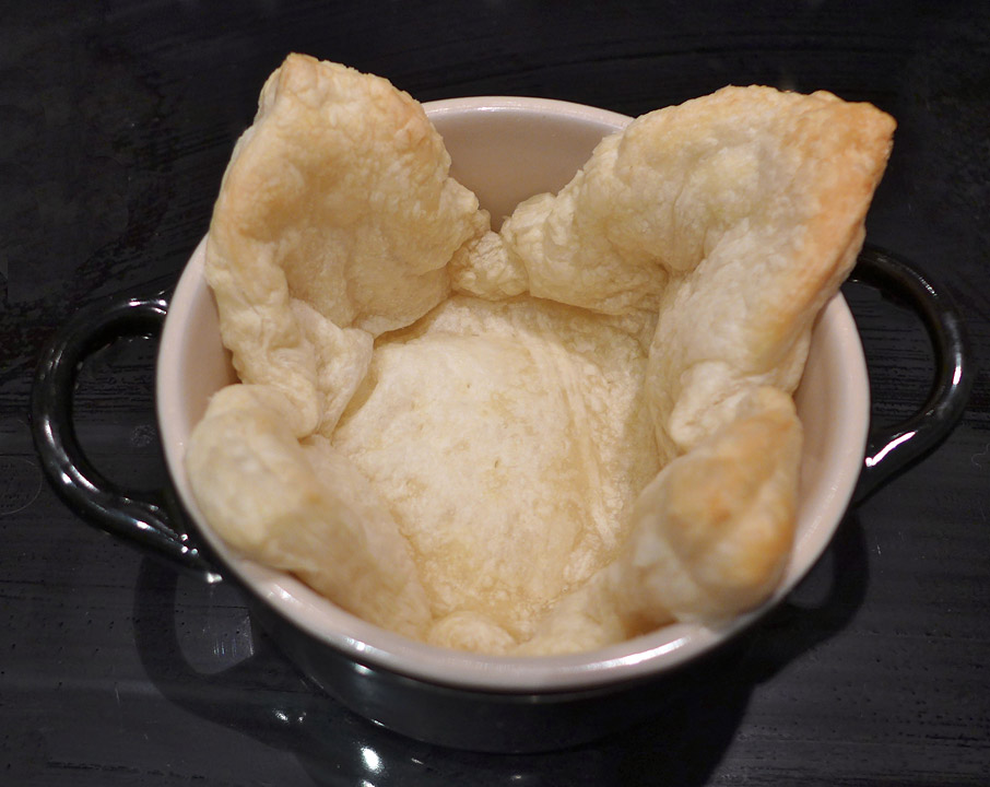 Start med å tine butterdeigen såpass at du klarer å kjevle den ut til nesten dobbelt størrelse. Kle en liten smurt form eller minigryte (porsjonsgrytene fra Le Creuset eller tilsvarende er perfekte til dette bruket), slik jeg bruker. Prikk deigen med gaffel og stek den nesten ferdig i ovnen på 220 grader, varmluft.