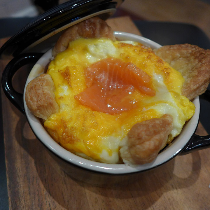 Pisk to egg og tilsett salt, pepper og 2-3 ss melk. Rør og hell røren i formen. Legg i noen små strimler med røkt ørret, laks eller bacon og smuldre litt god ost over. Jeg brukte mozzarella-ost.