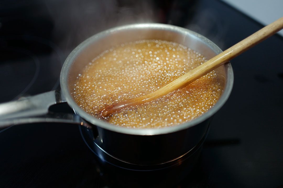 Hell nytrukket kaffe over i en kjele sammen med 2 dl sukker. Kok opp og la dette koke til du ser at boblene blir glinsete og gylne. Nå skjer det noe. Nå har væsken begynt å konsentrere sukkerinnholdet og sirup dannes. Du skal stå igjen med ca 2 dl sirup, så koketiden tar litt tid. Ikke gi deg før du ser at boblene er gylne og glinsete. Når det skjer koker du noen minutter til mens du rører i gryten.
