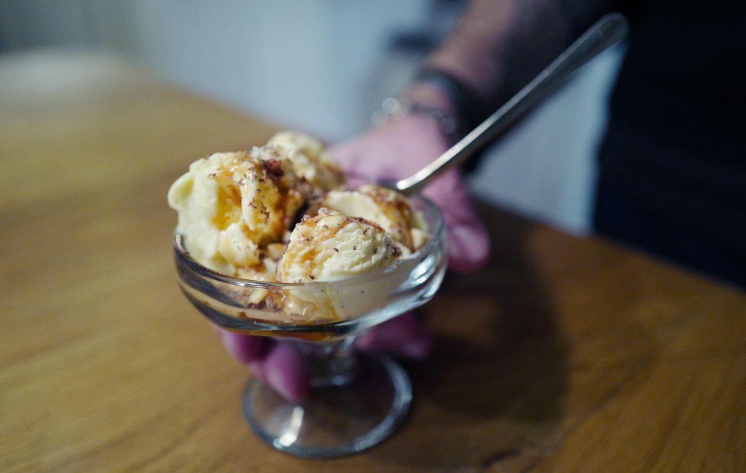 Hakk nøtter og rist dem i varm og tørr panne til de er gylne og de lukter deilig. Scoop et par kuler iskrem over i en skål. Riv (med et fint rivjern) marsipan og mørk sjokolade over iskremen. Dryss nøtter over og hell forsiktig en jevn stråle kaffesirup over desserten.