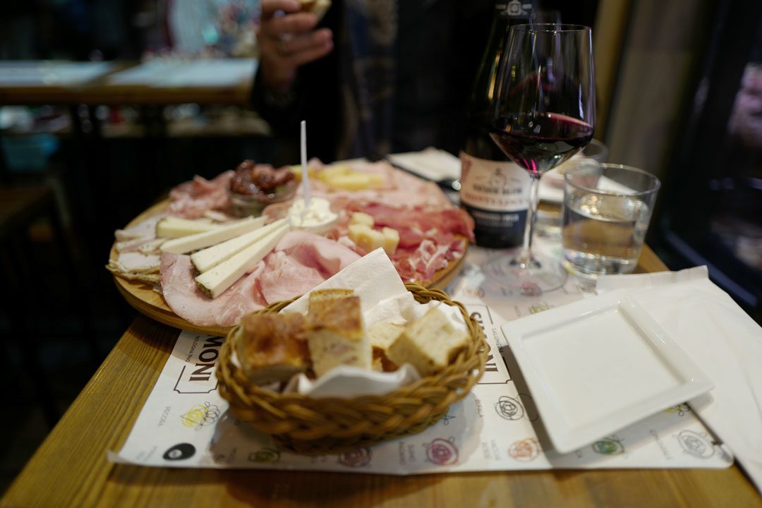 Ingen tid til trening. Vi må ut i gatene! Sultne som ville dyr finner vi tilbake til den herlige matgaten Via Pecherie Vecchie. Det funker alltid. På Salumeria Simoni får vi platting med oster, skinker og pølser og det lokale brødet crescenta som inneholder bacon og parmaskinke. What’s not to like!