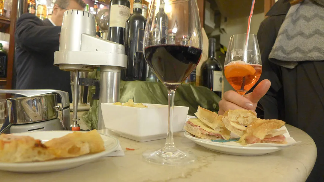 Når man har mistet bagasjen må man jo ha en del ting, så det er bare å komme seg ut i gatene og kjøpe det man trenger av toalettsaker og undertøy. Det koker av folk i gatene 2. Juledag og vi må ta en spritz- og vinpause midt i all shoppingen. Det er aperitivo-timen og godsaker kommer på benken. Etter å ha spist et knusktørt wienerbrød i Frankfurt for ørten timer siden, smaker det godt med italienske snacks.