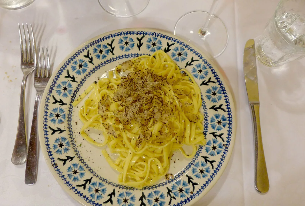 Vi må videre. Vi er tross alt både tørste og sultne. Negroni-stopp på en hyggelig bar på Santo Spirito-plassen og så går vi til vi ikke ser en eneste turist lenger. Nå kan vi lete etter restaurant. Trattoria dell’Orte har akkurat plass til oss og det er bare italienere der. Langbord med glade mennesker som skal kose seg på en lørdagskveld. Vi bestiller en herlig Chianti Classico (vi er tross alt i Chianti-land) og starter med crostini, pasta vongole og pasta med revet trøffel etterfulgt av peposo (langkokt oksekjøtt i masse sort pepper og vin) og gutta går for tagliata med rosmarin. (Tagliata er oksekjøtt som såvidt er stekt i kanten). Mer vin. Og så kaffe og grappa. For en herlig kveld! Vi vandrer ut i natten og stopper opp for øl på irsk pub. Hæ? Hva skjedde nå? Ok, dette var noe Arild ville. Nok om denne kvelden som ikke stoppet her.