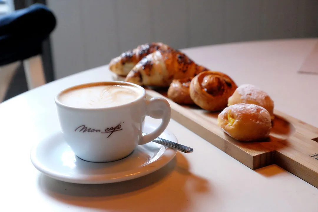 Vi har sovet som prins og prinsess på det fantastisk koselige BB, Quartopiano. Vi ble spurt om vi ville spise frokost her eller på caféen som de to karene som driver BB’en også driver. Vi drar på cafèen deres, vi. Mon café er en usedvanlig trivelig café ca 100 meter fra der vi bor. Interiørmessig er det samme stil. Det er populært og fullt. Vi får cappuccino, vann og et utvalg søte og salte bakevarer.