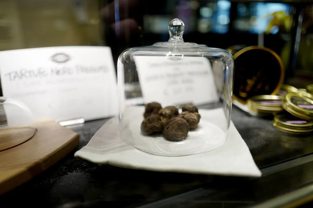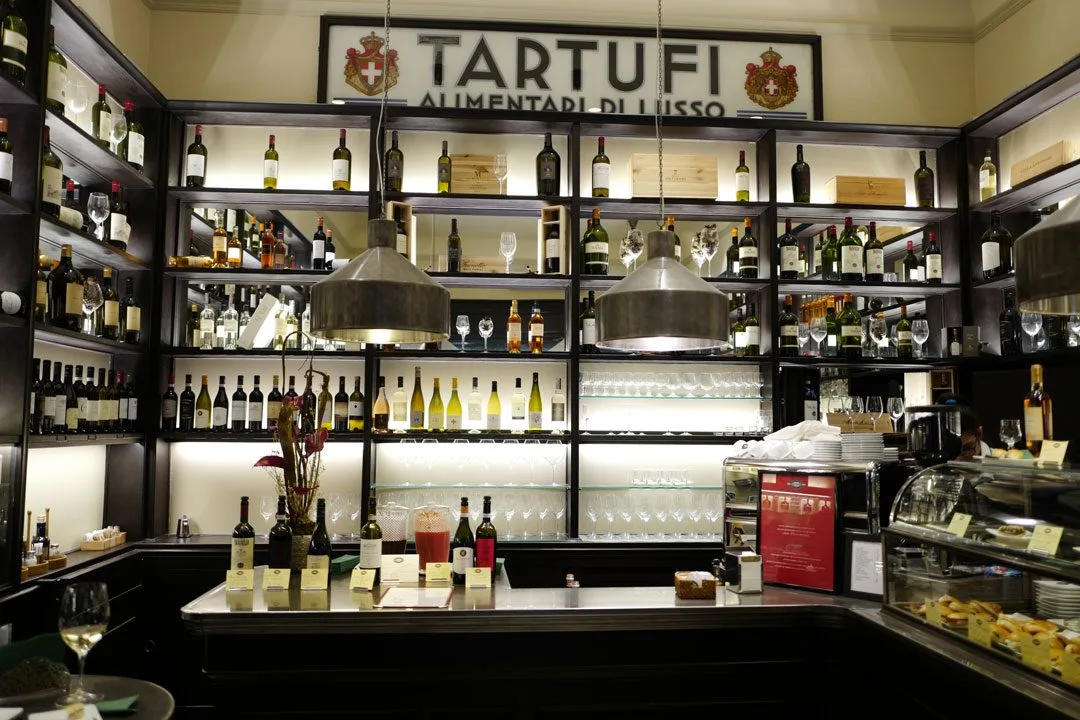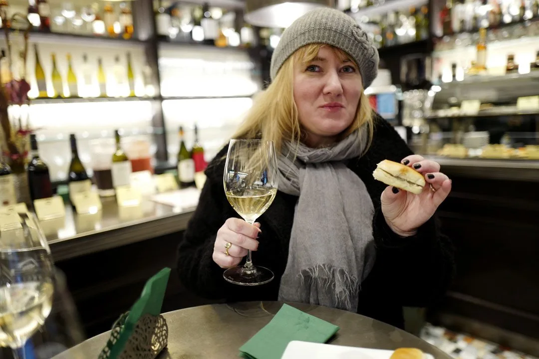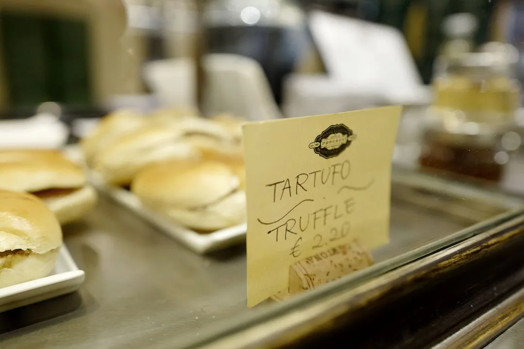 Vi er jo litt sene i avtrekkeren i dag, så når vi går nedover i byen er det faktisk lov til å stikke innom trøffelstedet vårt og ta en trøffelpanini og et glass toskansk hvitvin.