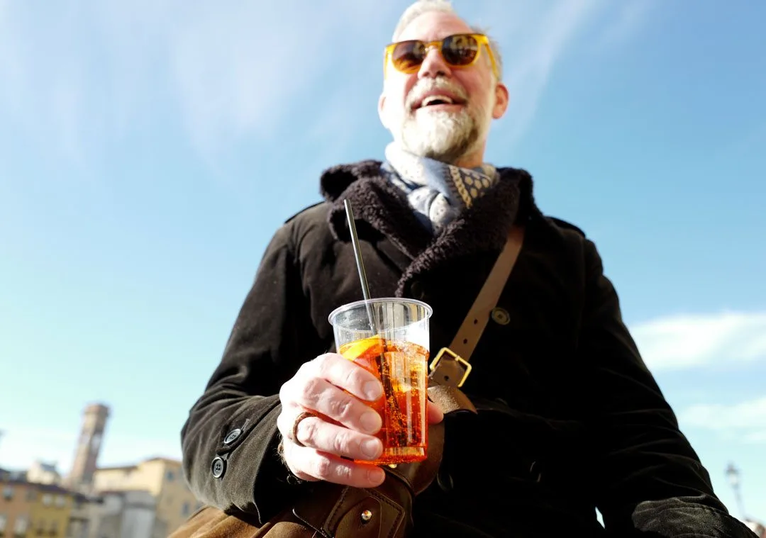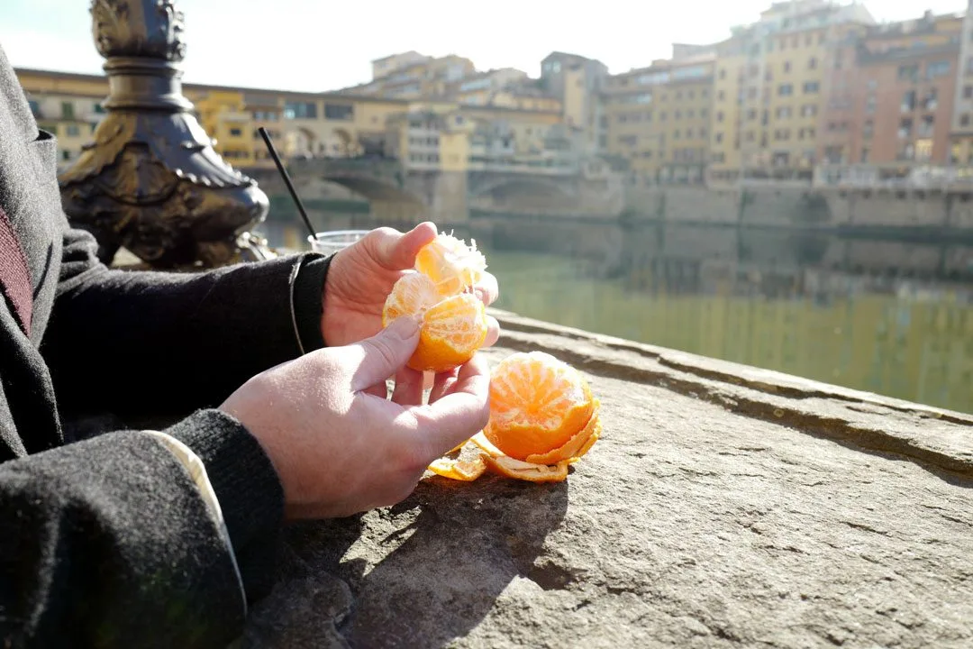 Solen stråler, som nevnt og vi går nedover i den julepyntede byen og ned mot elven Arno. Vi er ikke alene. Firenze er stappfull av nyttårsturister. Vi går mot spritz-stamstedet til Arild og her får vi en take away drink til å nyte ved Arnos bredder i solskinn. Vi har til og med kjøpt med både klementin og mandarin fra markedet og vi smaker dem opp mot hverandre slik vi også gjorde i fjor. Det er jaggu forskjell, altså.