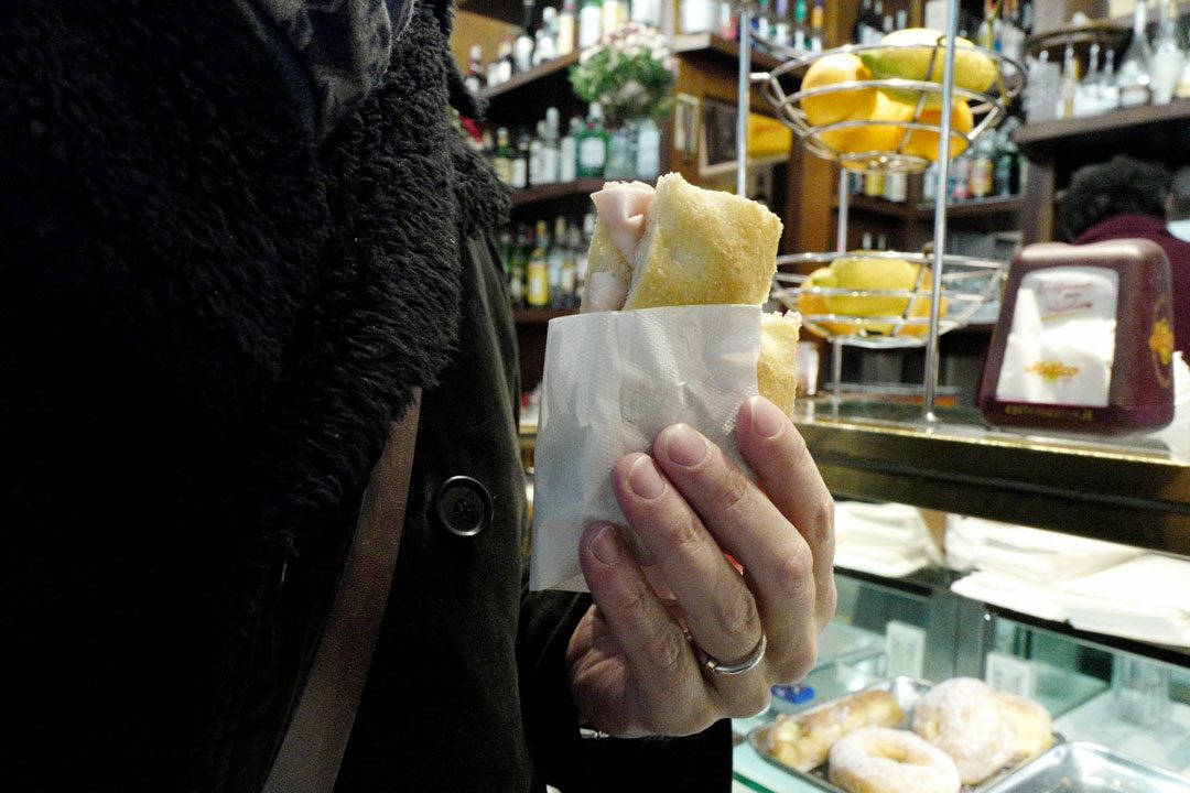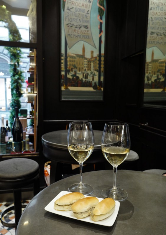 Vi handler med oss diverse deilige ting fra markedet og vandrer ut i regnet igjen. Og det regner skikkelig! Ja, da må vi vel søke ly på trøffelstedet vårt, da! Procacci i Via Tornabuoni har åpent igjen etter å ha stengt 1. nyttårsdag. Vi går for klassikeren: Trøffelpanini og et glass toskansk hvitvin.