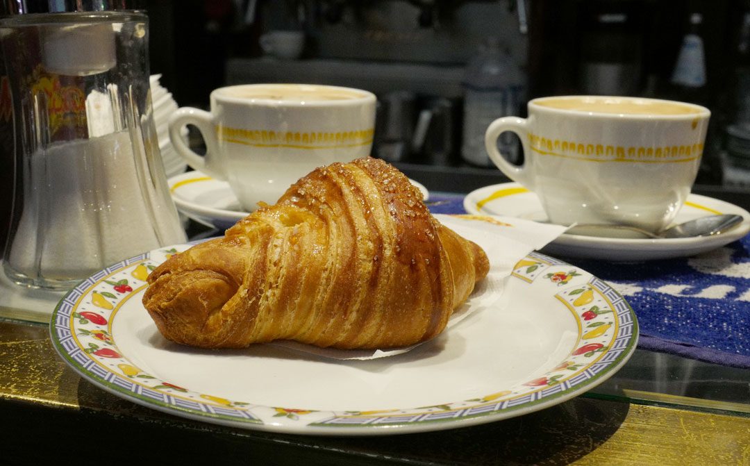 Det ligger en liten og veldig hyggelig kaffebar inne i det ene hjørnet, ved siden av de som selger tørket frukt og nøtter. Italiensk bakverk er så deilig. Syndig godt. Jeg velger en cornetto med kremfyll. Det jeg liker med cornettoene er at de har en deilig smak av appelsin. Du får også fullkorns-cornettoer og kornettoer med marmeladefyll. Prøv en slik neste gang du er i Italia. Til en slik søtsak passer det godt med en cappuccino laget på sterk, italienskbrent kaffe.