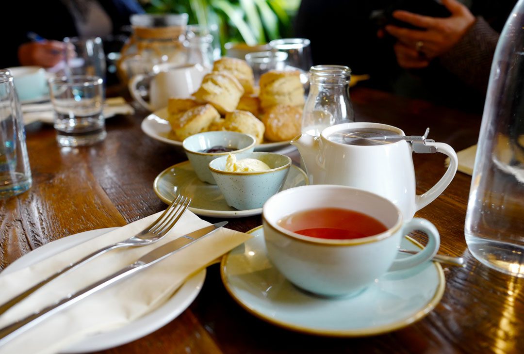 Vi spiser og drikker Cream Tea og drikker rom klokken 10 på morgenen. Kun en liten smak, men dog. Romen kommer selvsagt fra seilbåten.