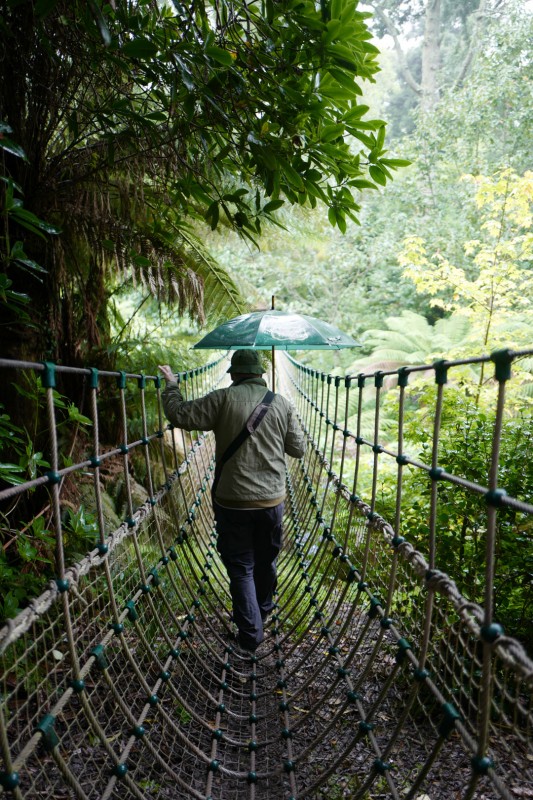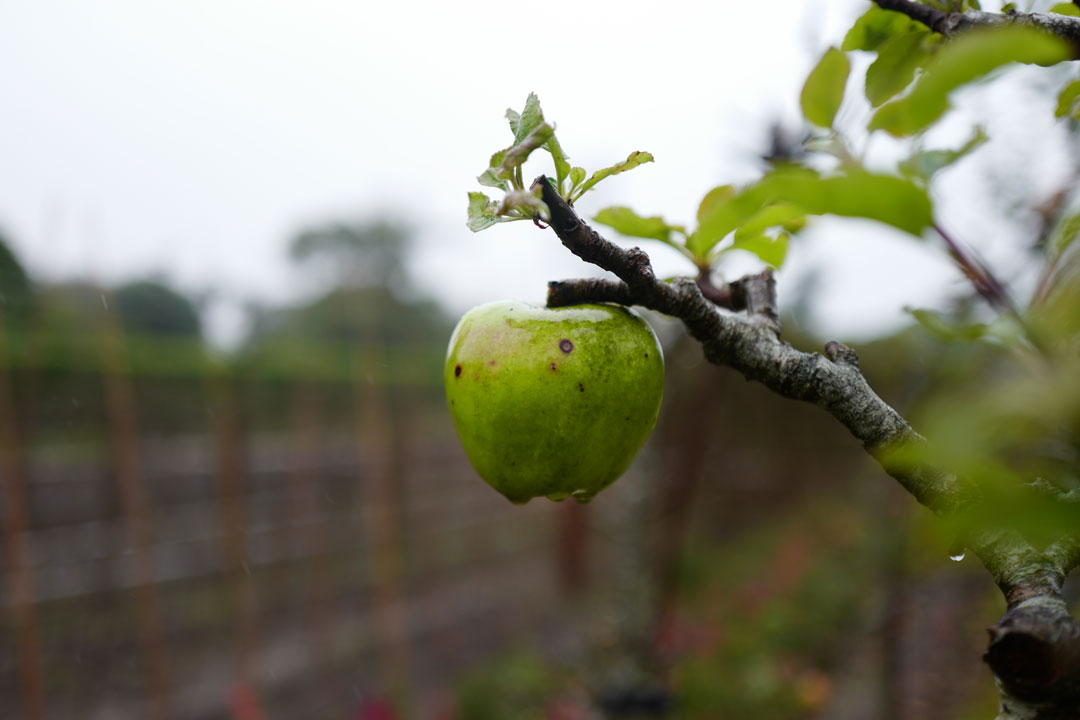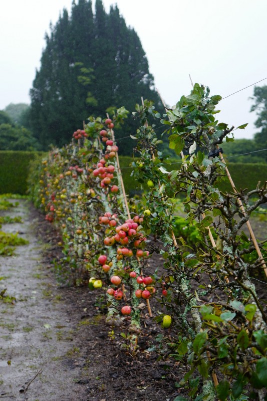 Vi er våte etter å ha vandret mellom epletrær og tropiske palmer, men svært fornøyde. For en flott hage!
