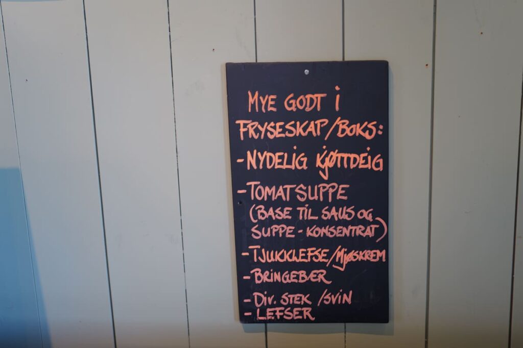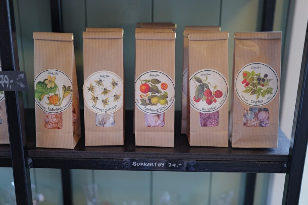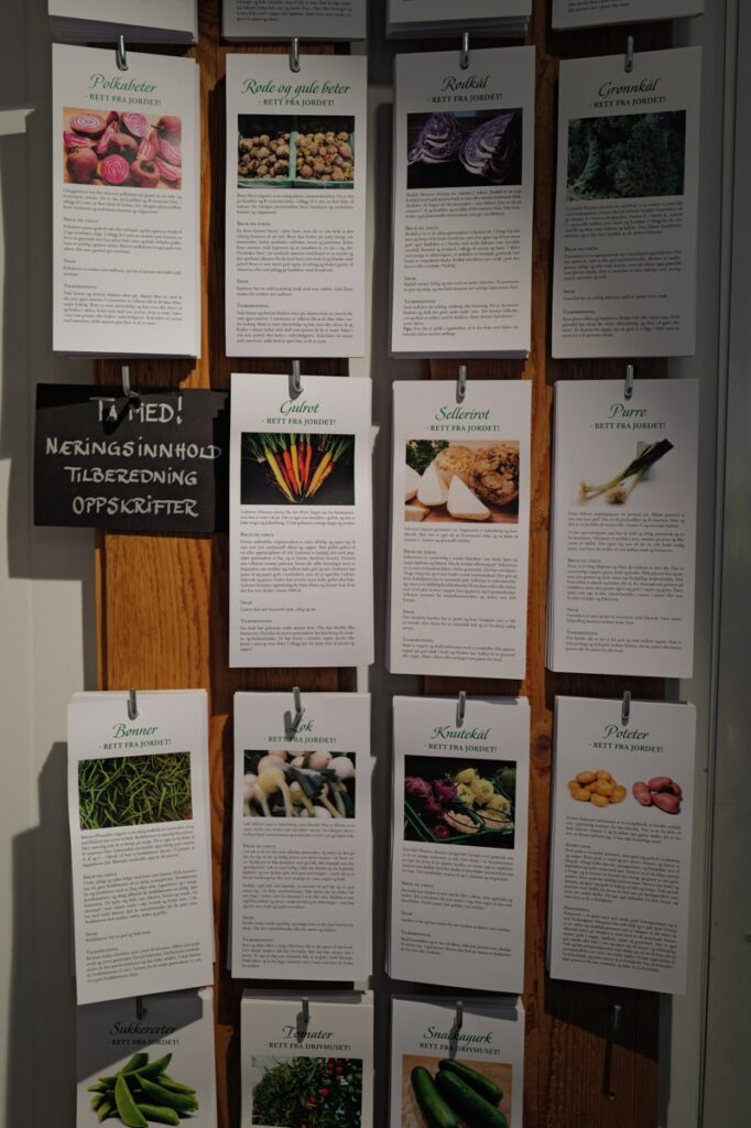 I butikken står varer plassert på hyller og bord. Foruten matvarer er det te, kaffe, godterier, kaker og TV en del gaveartikler som frister. I kjølerommet ligger grønnsakene pent stablet.