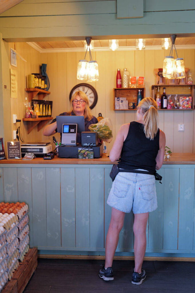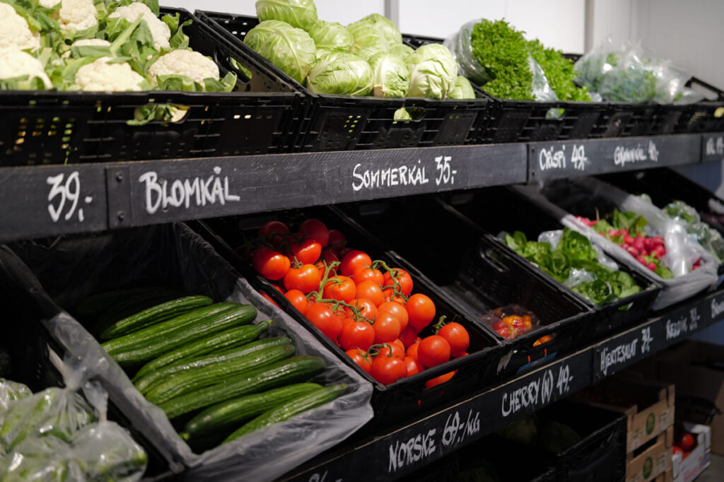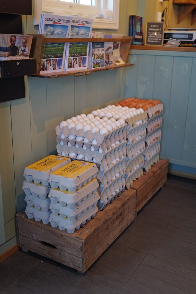 Louise driver med “Itte-reste” varer. Det vil si varer som er så kortreiste at de kommer fra gården. 50 prosent av varene i butikken stammer fra egen produksjon, og det er kål, løk og blomkål som er de tre store foruten eggene fra de 7500 hønene som kakler på gården. – Vi har rundt 35 forskjellige grønnsaker vi produserer selv som vi selger i butikken vår, forteller Gjør.
