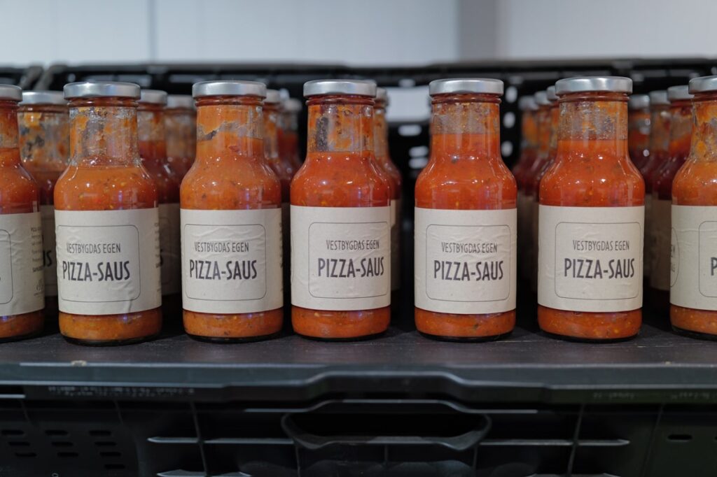 Der finner du også “Vestbygda egen pizzasaus” som er et resultat av slappe grønnsaker som egentlig skulle kastes. Dette ville ikke Louise og søkte derfor Innovasjon Norge om midler til å lage pizzasaus av de fullt brukelige tomatene.