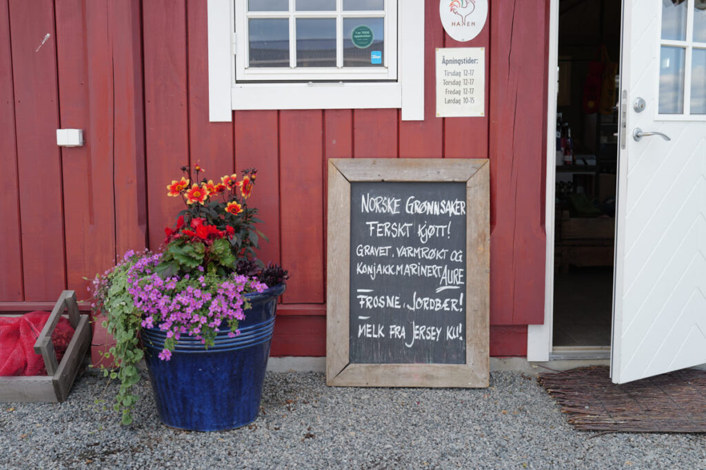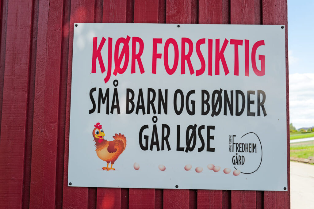 På låveveggen står det “Kjør forsiktig. Små barn og bønder går løse”. Når man svinger inn den vakre alléen opp til gårdsbutikken og runder hjørnet ved inngangen åpner landskapet seg opp og man kan se utover Mjøsa.