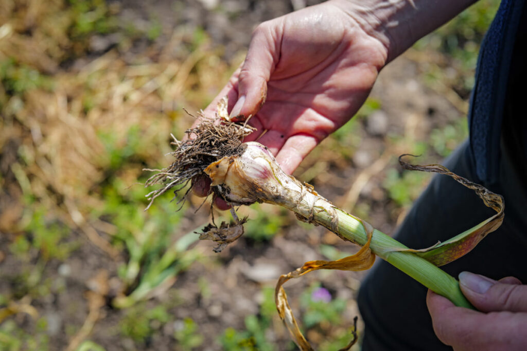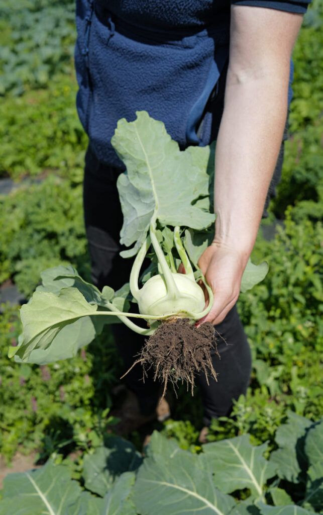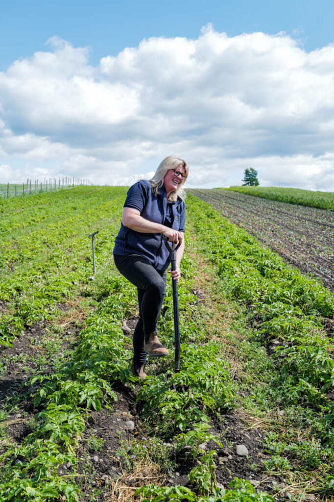 Ute på åkeren spar Louise opp tidligpotet. Hvitløken ser også ferdig ut. Louise tar med en perfekt knutekål inn i butikken og skreller den.