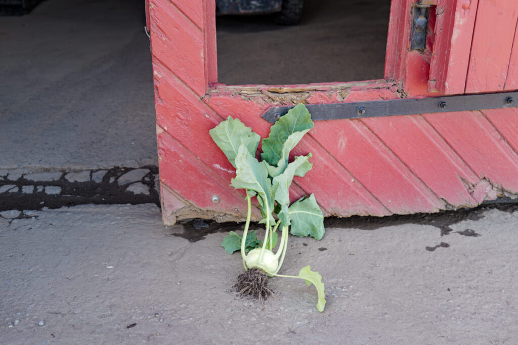 Inne i låven står kasser med kål, gulrot og potet til lagring fra i fjor. Matutdelingen på Stange og Frelsesarmeen henter grønnsaker som er av bedre kvalitet enn mye av det som finnes i dagligvare. Grønnsakene deles ut til folk som trenger det. – Det er bare å skrelle bort noen av de ytterste bladene på kålen, så er de like fine. Det handler om å oppbevare dem riktig, forteller Gjør. – De må legges i kasser like skånsomt som om de var egg, hvis ikke råtner de. Vi tar dem inn i august-september og så ligger de på kaldt lager til mai året etter. Så når man snakker om beredskapslager og selvberging, er det dette som gjelder. Gulroten har jord på seg, og da holder den lengre enn gulroten i dagligvare som er vasket og dermed blir slapp fort.