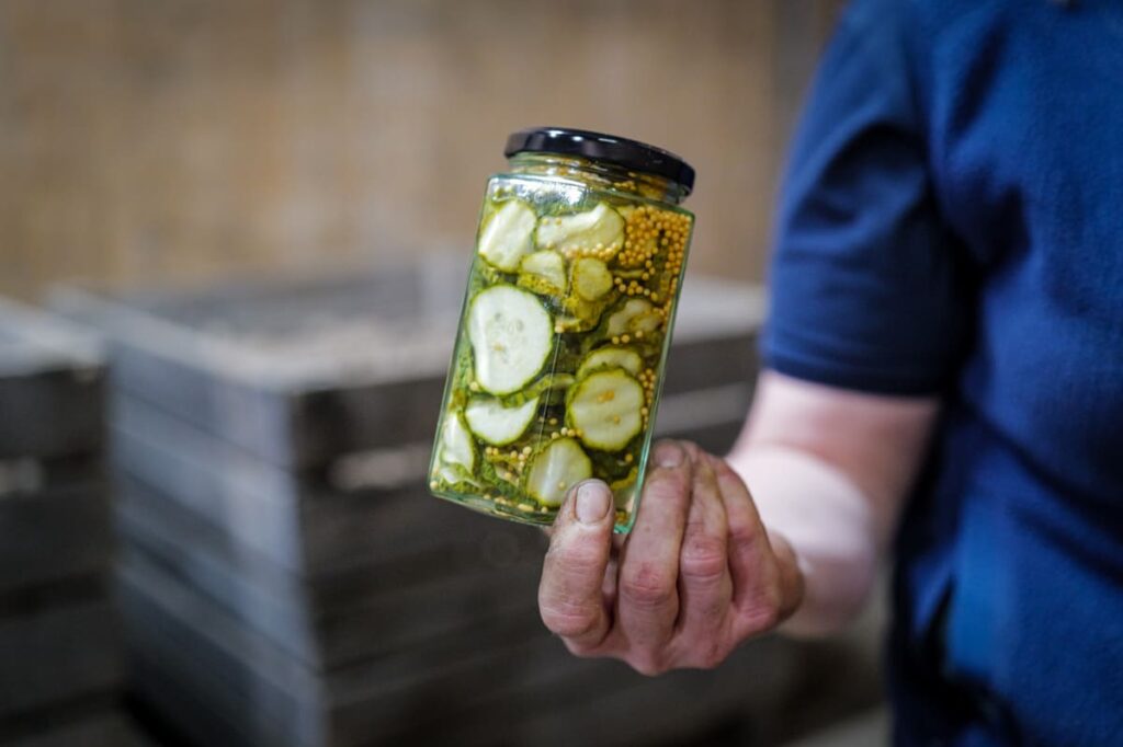 Hun viser frem sylteagurkene. Disse snitter hun og legger på glass til sylting. – Folk er helt ville etter dem og får ikke nok av dem! Dette er håndarbeid og derfor koster de såpass mye som de gjør. De er så enkle å lage selv, men det bryr ikke folk seg om. De vil ha disse. Jeg har nettopp laget et stort antall som straks er klare for butikken, sier Louise og vender på glassene som står opp ned.