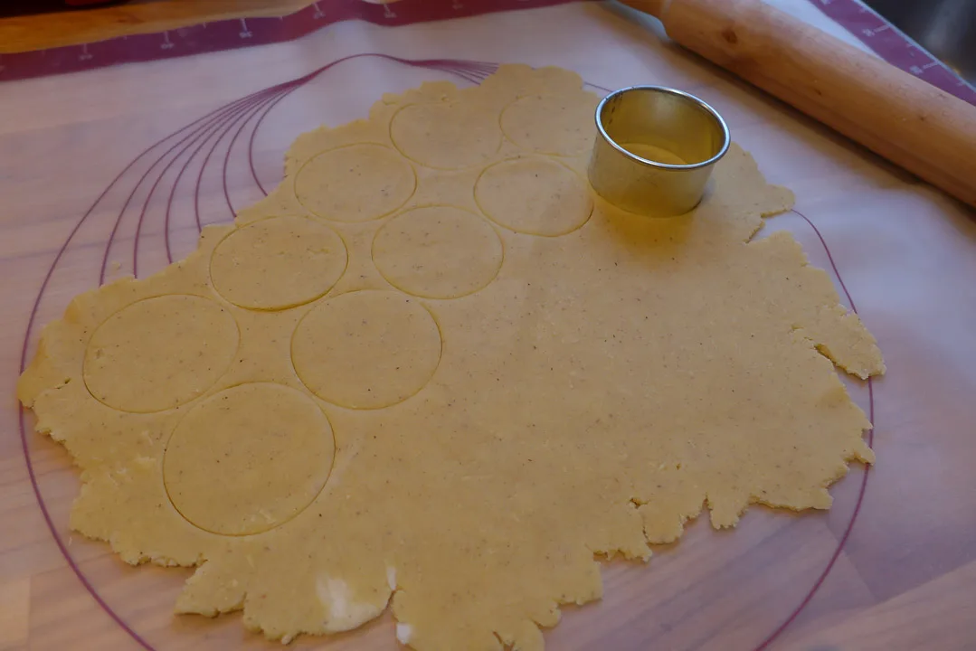 Kjevl så ut deigen til du har ca tykkelsen av en 20-kroning. Stikk ut sirkler med et utstikkerjern. Du skal kunne spise kaken i et jafs, så tenk på hvilken størrelse du velger. Jeg bruker et mønsterjern på toppen av kakene for å gi kaken litt ekstra oppmerksomhet.