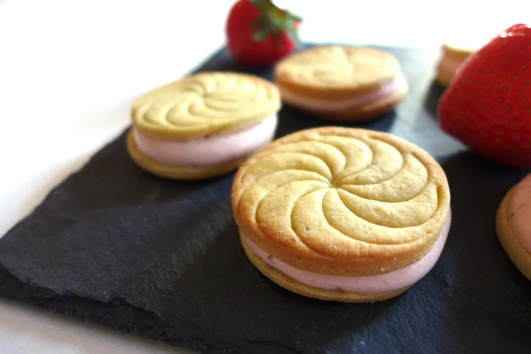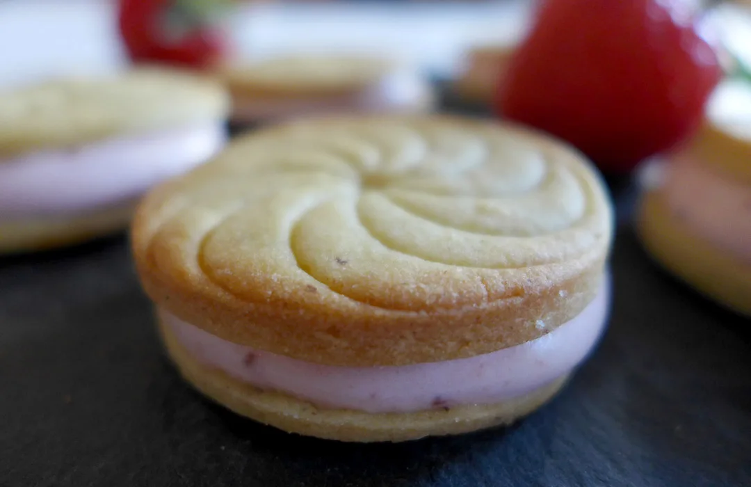 Jeg har mange gode barndomsminner fra sommerferiene mine hos mormor og morfar i Danmark. Et av disse (foruten min mormors fantastiske kyllingstek) er medaljene mormor serverte til te. Medaljer er små tertekjeks med fyll i midten. Mormor pleide å ha vaniljekrem og friske bringebær fra hagen i midten av medajen. Kombinasjonen vanilje og bringebær er uslåelig og kanskje det beste jeg vet når det kommer til søte retter. Jeg kunne selvsagt laget dette, men fikk lyst til å lage en jordbærkrem. Det ble også fantastisk godt!