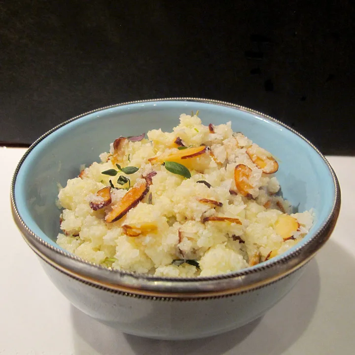 Det jeg gjorde var å dele alle «buskene» av en blomkål (bruk alt unntatt selve stilken. Den kan du jo bruke til noe annet) og legge dem i en kjøkkenmaskin. Kjør det til du får en grynete konsistens. Så fyller du en gryte med vann og litt salt. Hell blomkålgrynene i gryten. Kok opp vannet og hell av alt i et dørslag med en gang det har kokt. Ikke la blomkålen bli vassen, så pass på. La blomkålen renne godt av. I en bolle tilsetter du en toppet spiseskje smør, olje eller ghee, litt flaksalt og litt finhakket timian og kanskje noen ristede mandelflak. Bland forsiktig og server som tilbehør til kjøtt eller fisk.