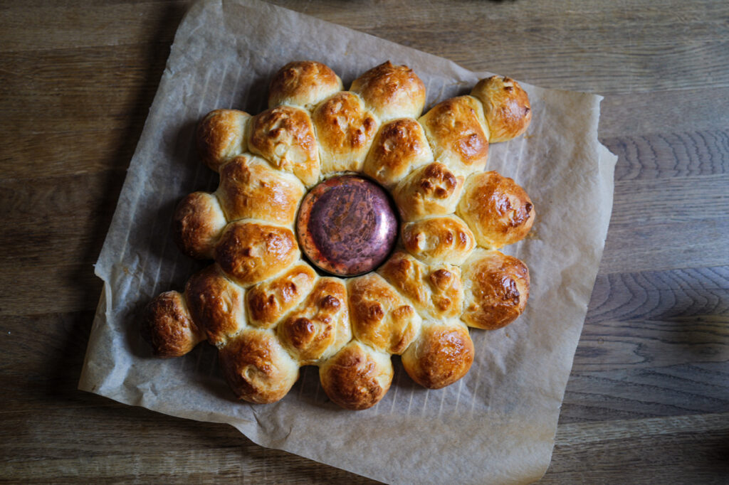 - Finn frem et bakebrett og legg bakepapir på brettet. Sett en ildfast skål i midten slik at hullet der smøret skal være forblir rent for brød. Dekk så med en krans av boller. Lag det mønsteret du selv ønsker. Etterhev en halvtimes tid. Sett ovnen til 180 grader, varmluft.