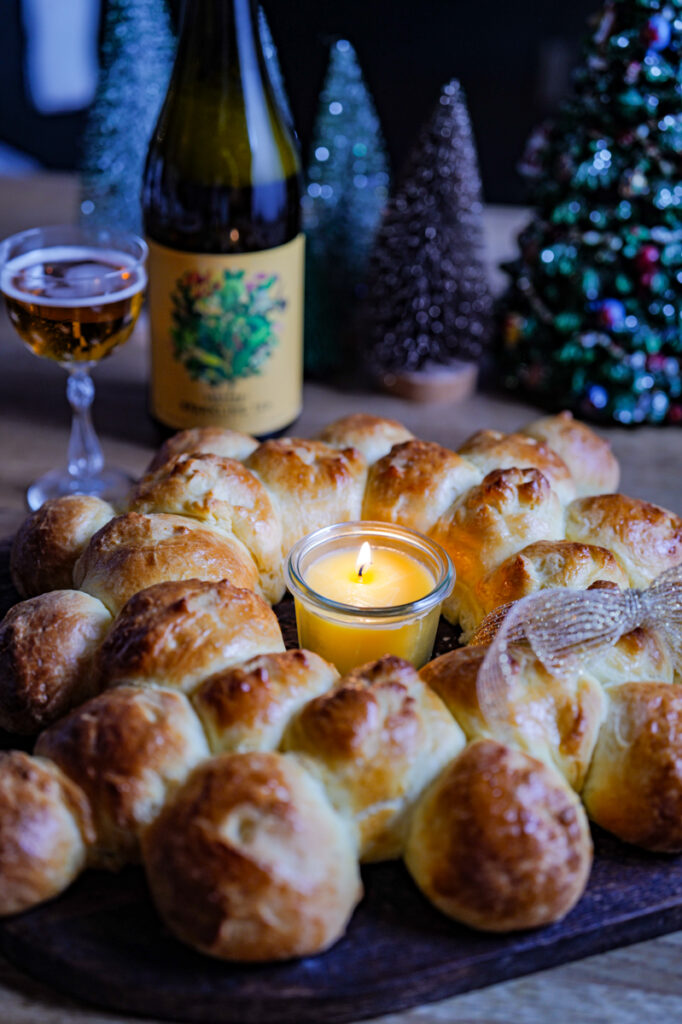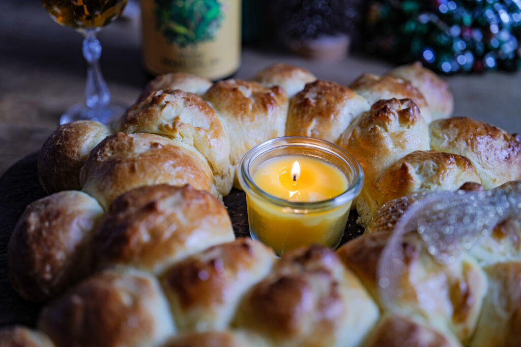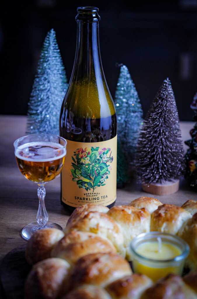 - Server med en sløyfe og lyset i midten. Du kan som nevnt servere spekemat og oster til dette, eller bare brødet og smøret. Men husk å ha noe godt i glasset og min anbefaling er Bergamot Oolong Sparkling Tea fra Pettersson & Munthe.
