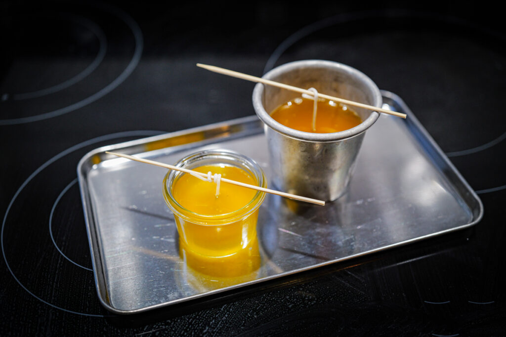 - Sett en veke midt i et glass eller en form. Bind det opp med en pinne slik at veken står sentrert. Hell på smør og sett kjølig til lyset er fast. Tenn på ved servering. La det brenne litt før du dypper brød i smøret.