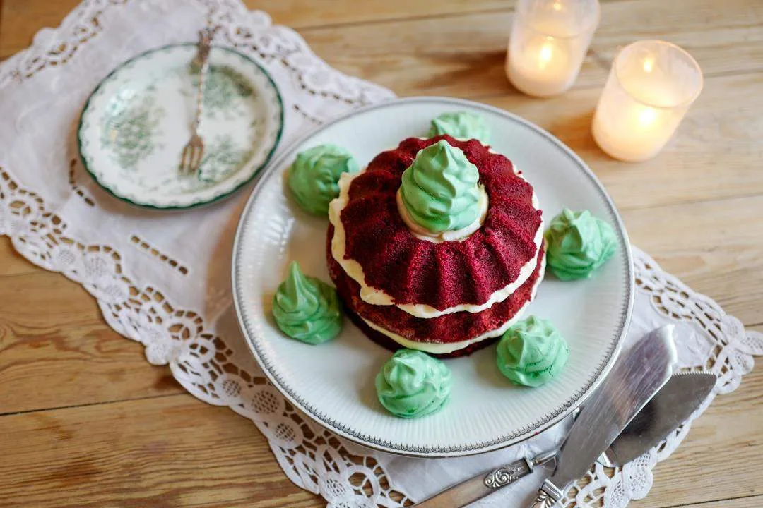 Red Velvet Cake er en rød sjokoladekake som er supersaftig. Kremen er en ostesmørkrem og til denne kreasjonen har jeg laget marengsjuletrær. Sånn akkurat overkommelig for mine tvilsomme bakerferdigheter.