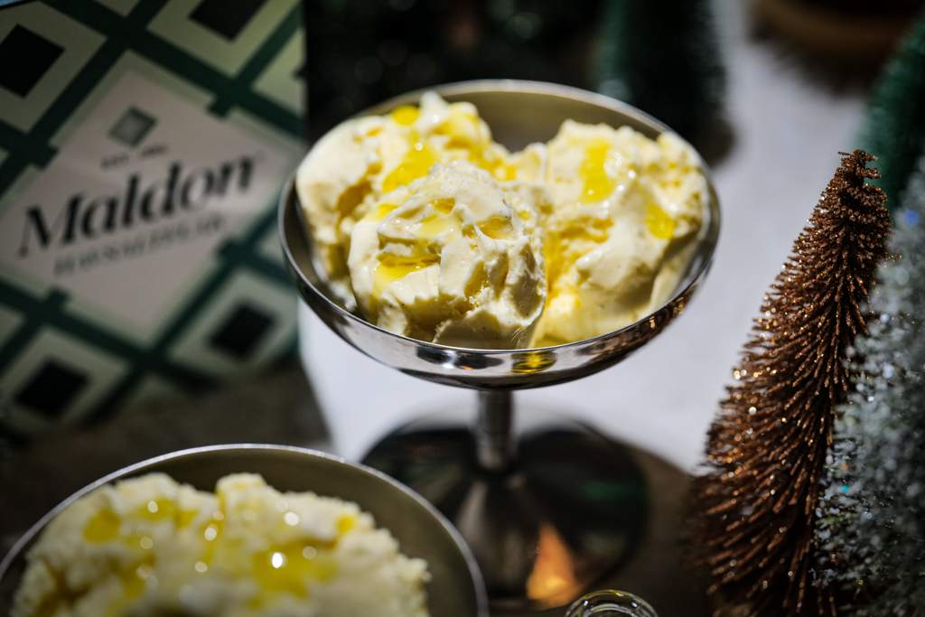 Scoop is i serveringsskåler. Ved servering heller du litt god extra virgin olivenolje over iskremen før du knuser et par saltkrystaller fra Maldon-boksen din over toppen. Voilà!