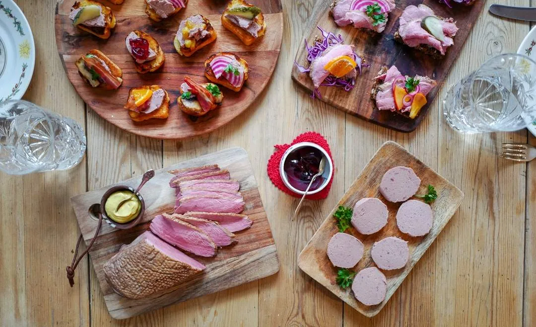 Du kan også sette frem en fjøl med skiver av varmrøkt and og en liten skål med dijonsennep. Det er ofte alt man trenger sammen med litt godt flatbrød. Sett også frem andepaté og en skål med god gelé slik at folk kan ta en liten blings når smørrebrødfatene er tømt.