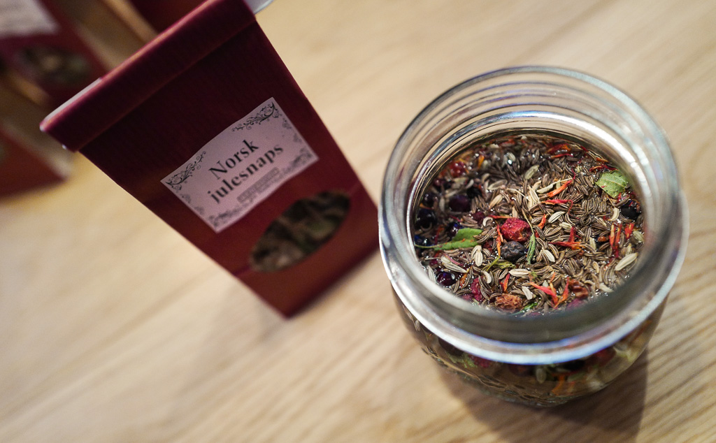 Norsk julesnaps inneholder karve, anis, fennikel, rognebær, einebær, saflor (fargetisler) og pors.