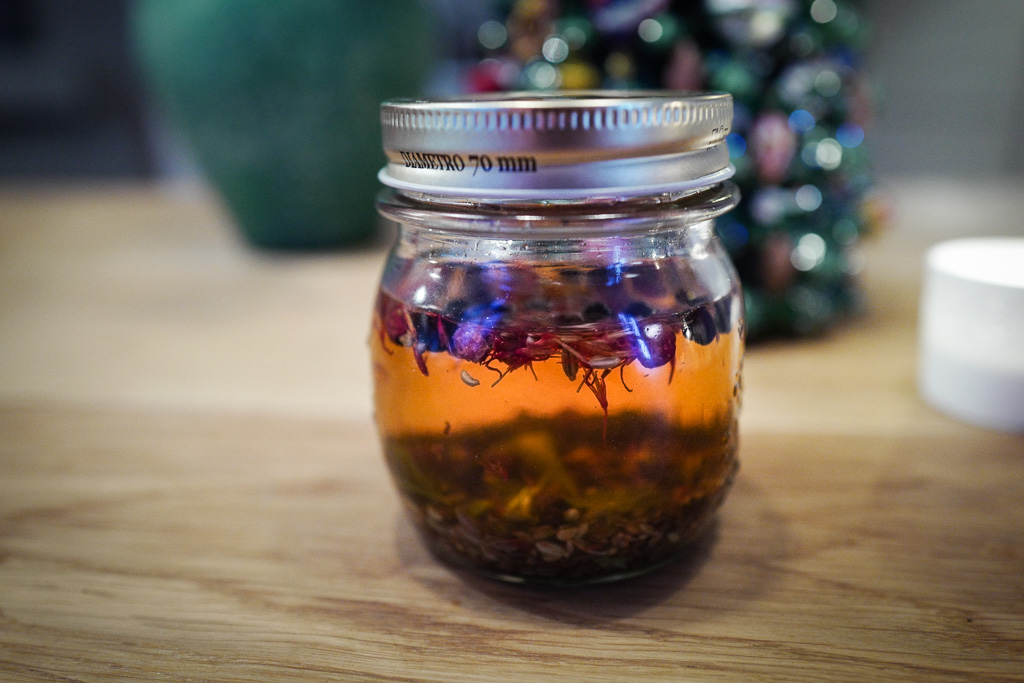 Det var virkelig enkelt å lage denne selv. 1 liter nøytral sprit + en pose Norsk Julesnaps-krydder lå i 24 timer på glass med lokk. Så silte jeg bort krydderne og helte den ferdige snapsen over på små flasker som jeg skal gi bort i julegave i år.