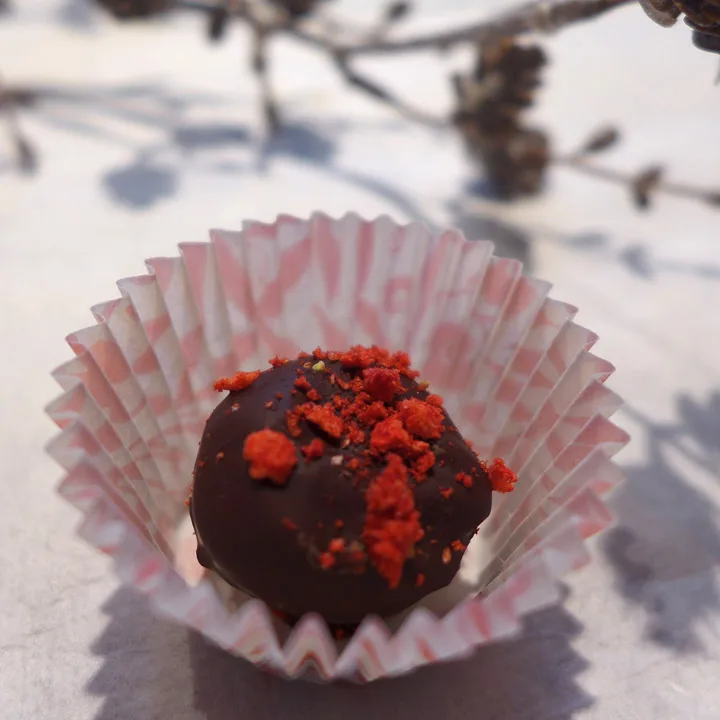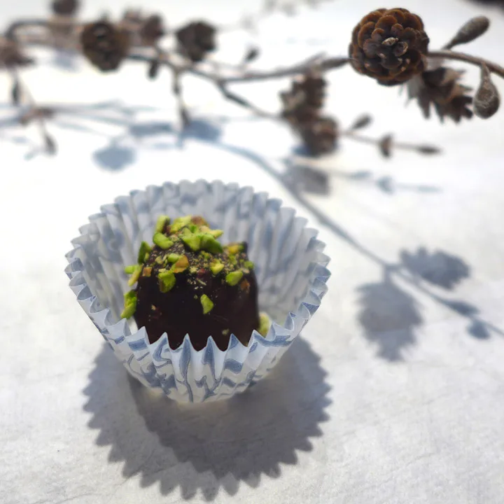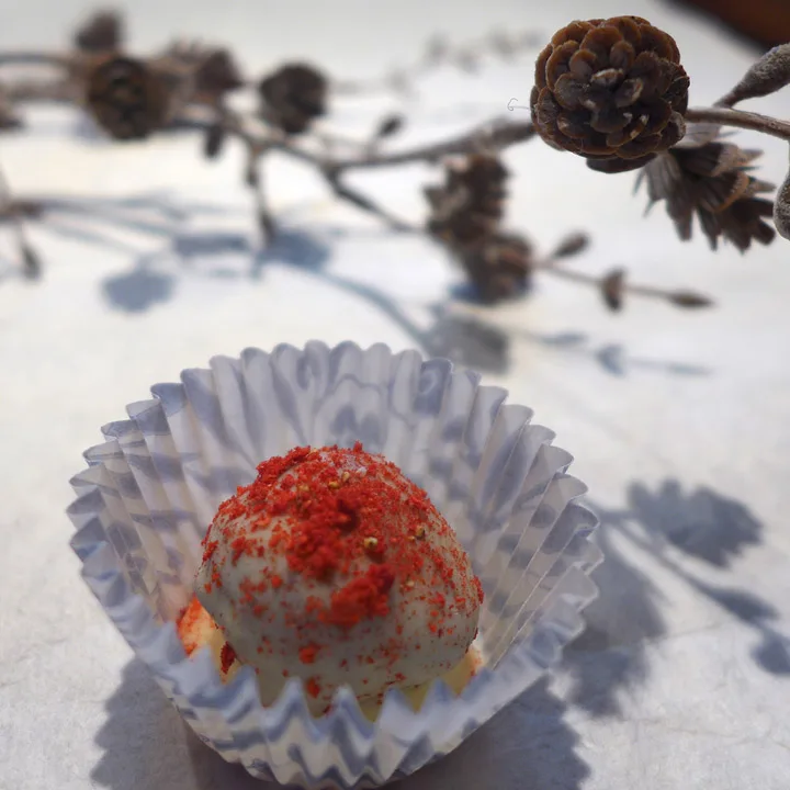 Smelt hvit eller mørk sjokolade i vannbad og trekk hver kule i sjokolade. Pynt med det du vil.