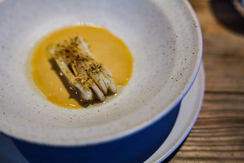 Hvit asparges, sukkertarer, pepperrot og urter. Hver bit er forskjellig.