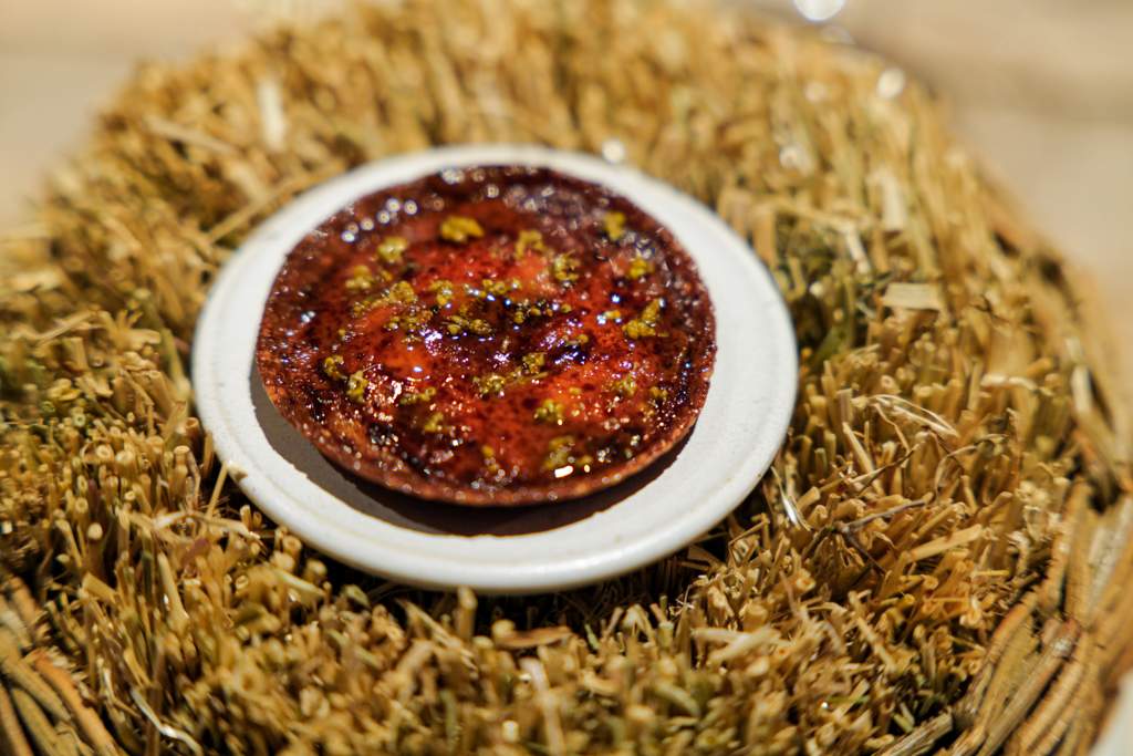Desserten Nicolai sikter til er en fudge laget med røkt svinefett, maur, bipollen, kombu, krokan laget av solsikkefrø og toppet med furu.