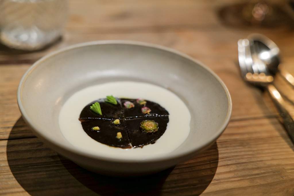 Kombu og røkt svinefett-fudge, magnolia-olje og fløte.